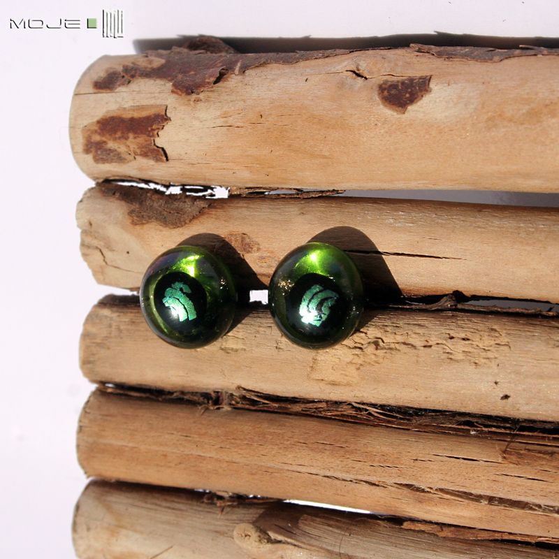 Maleńkie szklane kolczyki - sztyfty z zielonego i opalizującego szkła. Idealne dla pań lubiących mały i niezobowiązujący dodatek do stroju, który jednak potrafi nadać szyk.