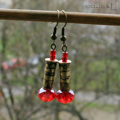 Kolczyki, które powstały z mosiężnych łusek, które wytrawiłam i spatynowałam. Ozdobą są szklane fasetowane kulki w żywo-czerwonym kolorze, pięknie połyskujące w słońcu. Zawieszone na metalowych biglach w kolorze mosiężnym.