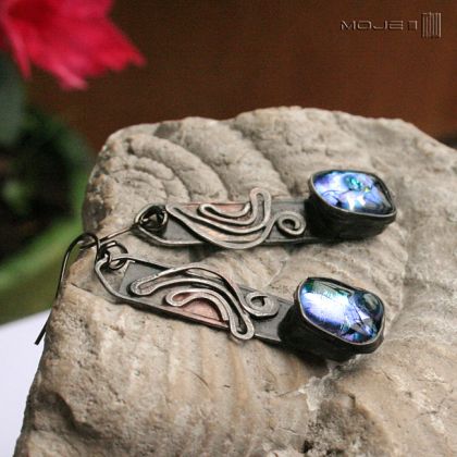 Wykonane są z miedzi - cynowanej, patynowanej i przecieranej. Ozdobne oczko zrobione jest przeze mnie ze szkła dichroicznego metodą fusingu, czyli topienia szkła w wysokiej temperaturze. W świetle pięknie opalizują od błękitu do morskiej zieleni.