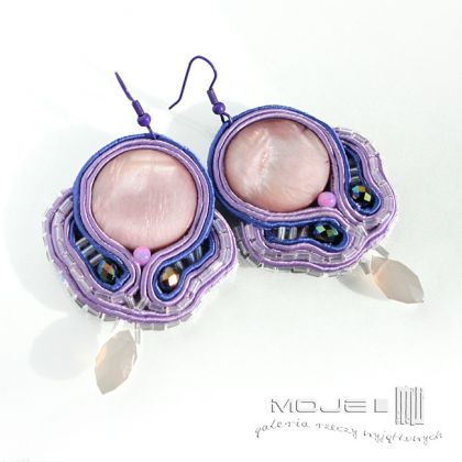 Największy element to pastylka z masy perłowej, dodatkowo ozdobione szklanymi mieniącymi się koralikami. Podklejone jasnowrzosowym filcem. Kolczyki obustronnie impregnowane.