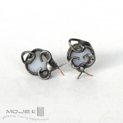 Malutkie kolczyki-sztyfty - myszki. Zrobiłam je z białego szkła z delikatną perłową poświatą.