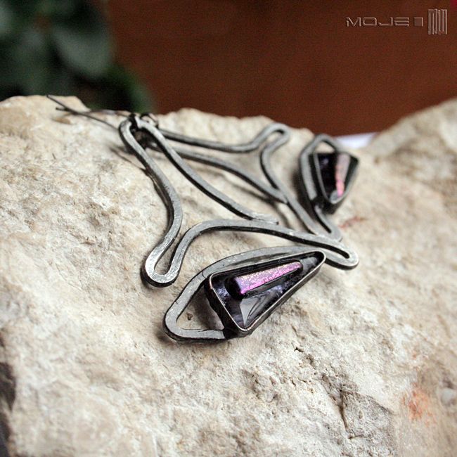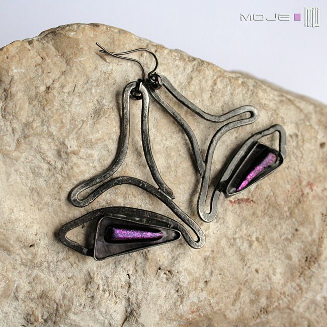 Wykonane są ze szklanych trójkątów wytopionych przeze mnie ze szkła bladofioletowego i dichroicznego metodą fusingu w temp. minimum 800 stopni oraz z młotkowanej miedzi - cynowanej, patynowanej i przecieranej. Metalowe bigle.