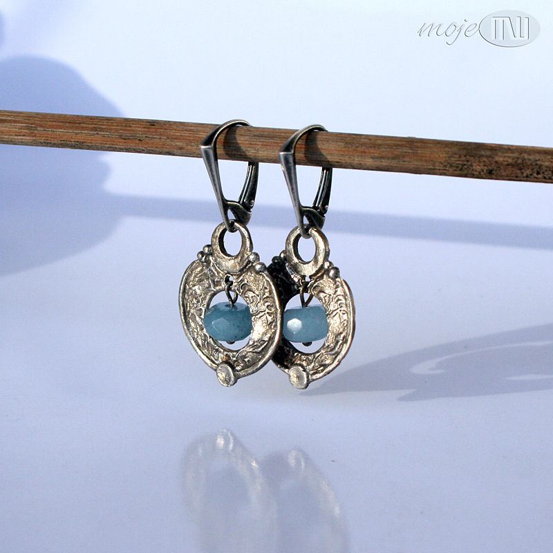 Delikatne kolczyki z ornamentem odciśniętym w srebrze. W centralnym punkcie zawieszona jest fasetowana oponka z niebieskiego awenturynu. Srebro jest oksydowane i przecierane dla wydobycia wzorów. Zawieszone na zapinanych biglach angielskich.