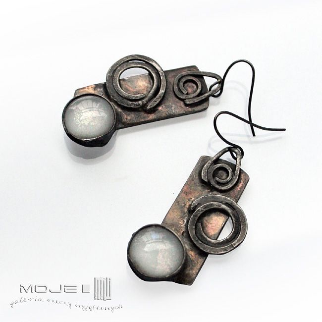 Kolczyki z miedzi, ozdobione białym, delikatnie opalizującym okiem ze szkła. Szkło wypaliłam metodą fusingu w temperaturze 800 stopni, przez co jest trwałe i mniej podatne na zarysowania.