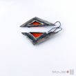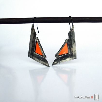 Ostre, dynamiczne, surowe w swoim wyglądzie i wyraziste zarazem kolczyki wykonane z pomarańczowego witrażowego szkła oprawionego w miedź. Miedź jest cynowana, patynowana na grafitowo, przecierana i drapana.