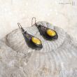 Proste kolczyki o surowym wyglądzie. Ich ozdobą jest żółte oko ze szkła dichroicznego, które wytopiłam metodą fusingu. Szklane oko delikatnie opalizuje i połyskuje w promieniach słońca. Szkło oprawione i wykończone jest miedzią - cynowaną, patynowaną i przecieraną.
