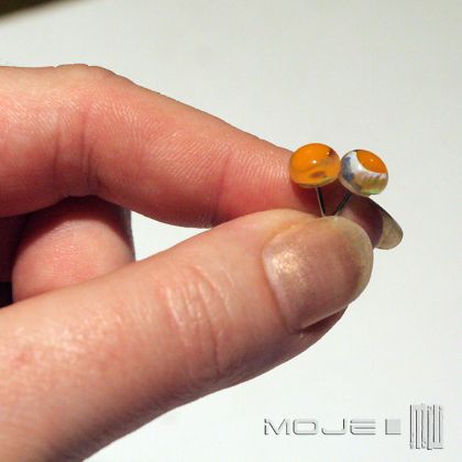Maleńkie szklane kolczyki - sztyfty, delikatnie mieniące się tęczowo, z kroplą pomarańczu, który nadaje im wesołości i lekkości. Pasują zarówno do słonecznego dnia - podkreślają wtedy radosny nastrój, jak i do dnia pochmurnego, bo dzięki nim staje się on mniej szary...