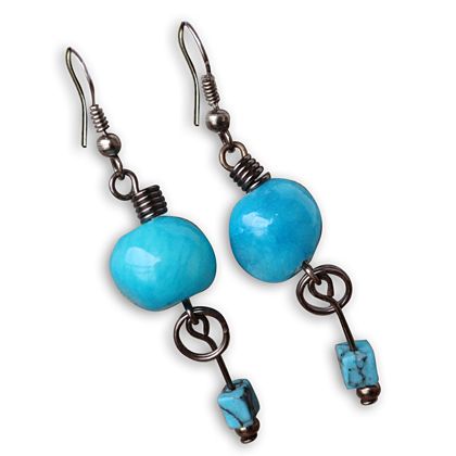 Kolczyki w intensywnym błękitnym kolorze, z marmurowych kamyków, turkusowych kostek i stalowych elementów w kolorze grafitowym.