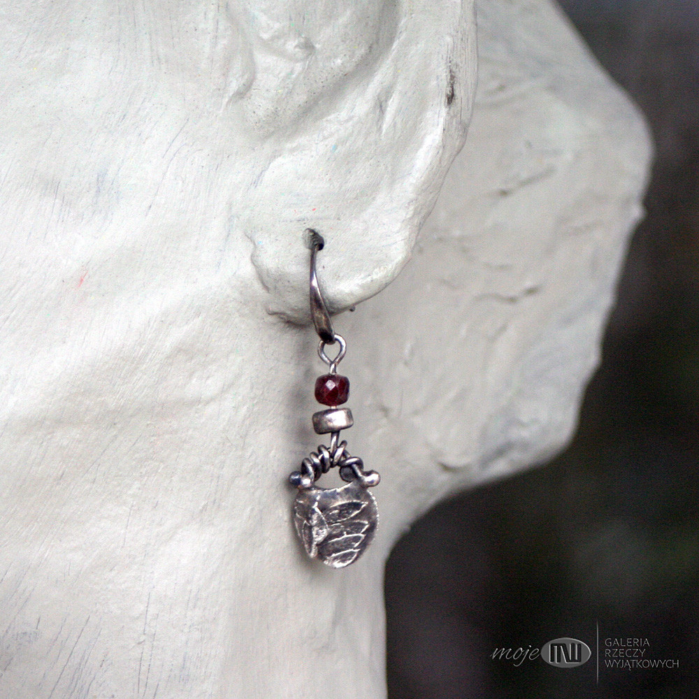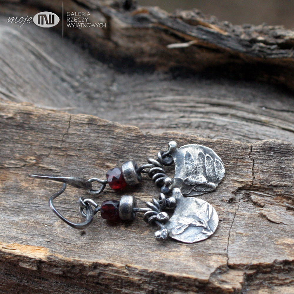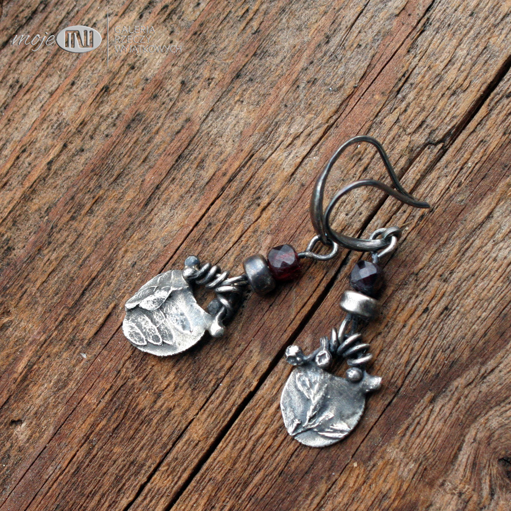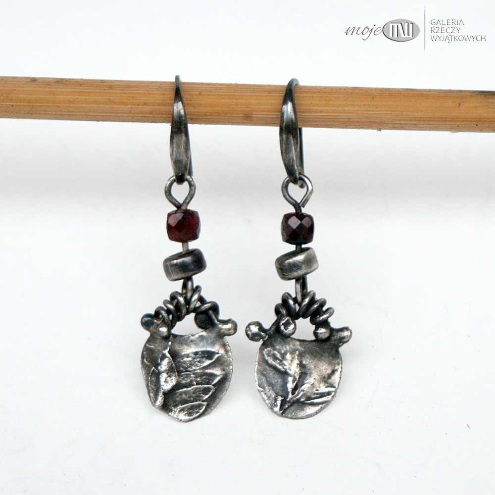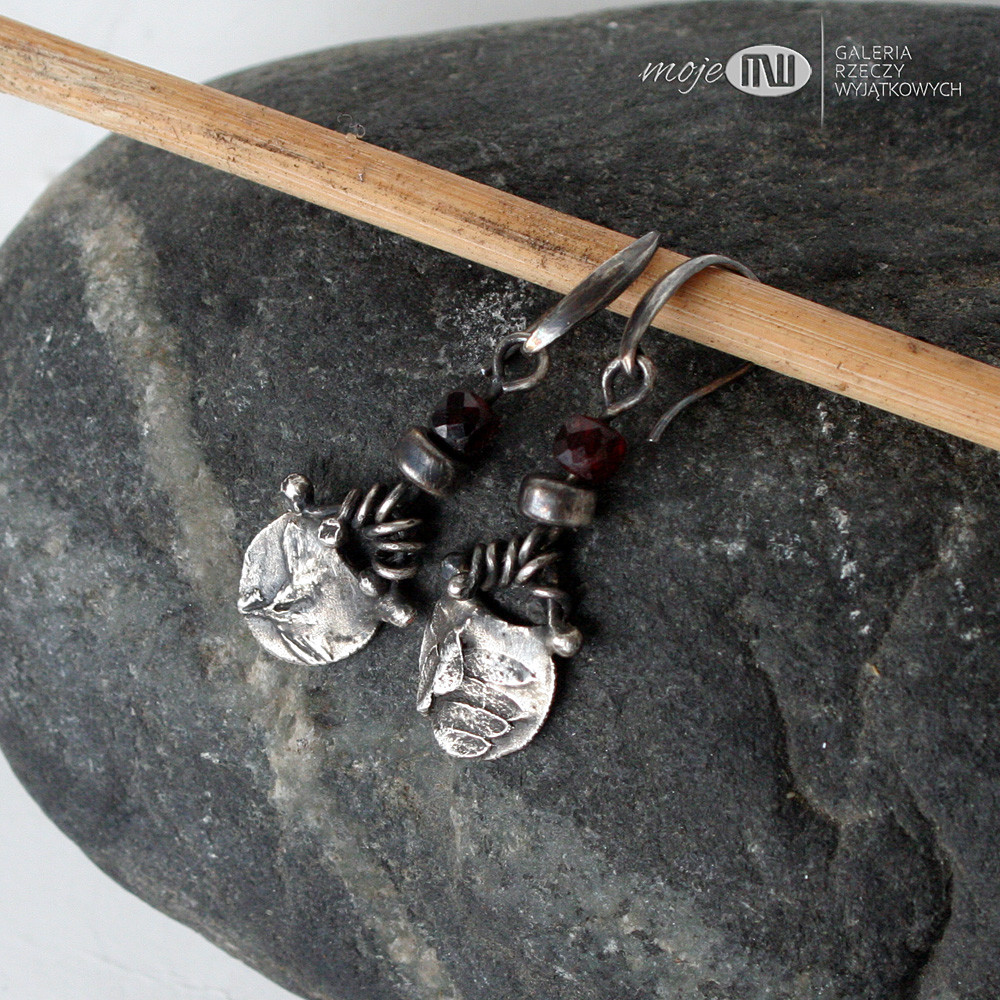 Wiszące niewielkie kolczyki z ręcznie formowanego srebra z oponką granatu. Wizerunek polnej roślinki - oksydowany i częściowo polerowany dla wydobycia wzoru. Kolczyki ozdabiają fasetowane oponki granatu 4 mm. Zawieszone na srebrnych biglach.