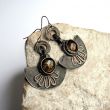 Półokrągłe kolczyki z tajemniczym okiem, które jest ni to czarne, ni to złotawe... Kształtem nawiązują do wzorów egipskich. Wykonane są z miedzi - cynowanej, patynowanej i przecieranej. Ozdobne oczko zrobione jest przeze mnie ze szkła dichroicznego metodą fusingu, czyli topienia szkła w wysokiej temperaturze. Metalowe bigle.
