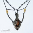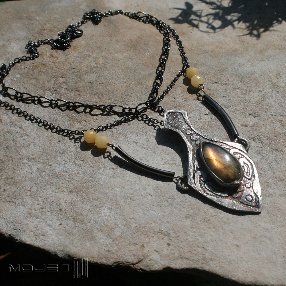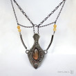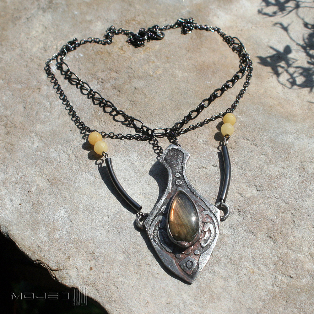 Zrobiłam go z miedzi - trawionej, pokrytej cyną i patynowanej. Ozdobą jest kaboszon w formie łzy z labradorytu w pięknym kolorze ciemnego złota przechodzącego w odcienie pomarańczu. Dodatkowo zdobią go także fasetowane marmurowe kulki w kolorze bladej żółci. Podwójny łańcuszek dodaje mu stylowości.