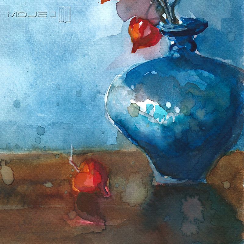 Akwarela utrzymana w ciepło-zimnej gamie barw - niebieskich i pomarańczowych, malowana na papierze akwarelowym. Oprawiona w zgaszone granatowe passe partout, które dopełnia i podkreśla kolorystycznie całość.