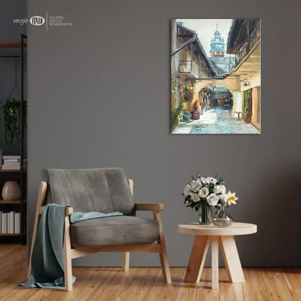 Zaułek na krakowskim Kazimierzu - przejście między ulicą Beera Meiselsa a Józefa, w tle widać kopułę kościoła Bożego Ciała.