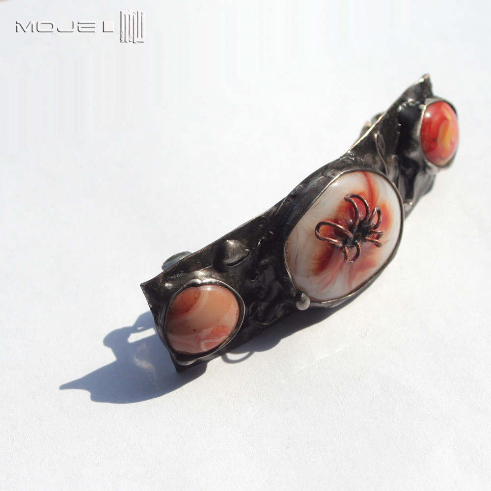 Klamra do włosów z miedzianej blachy i szklanych kaboszonów w odcieniach pomarańczu i bieli. Miedź jest cynowana, patynowana i przecierana. Klamra to standardowy metalowy mechanizm.