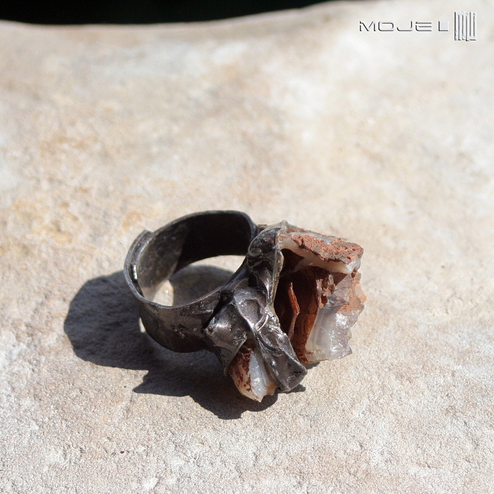 Pierścionek z naturalną surową bryłką agatu w kolorach szaro-brązowych. Kamień oprawiony jest minimalistycznie w cynowaną, patynowaną i przecieraną miedź.