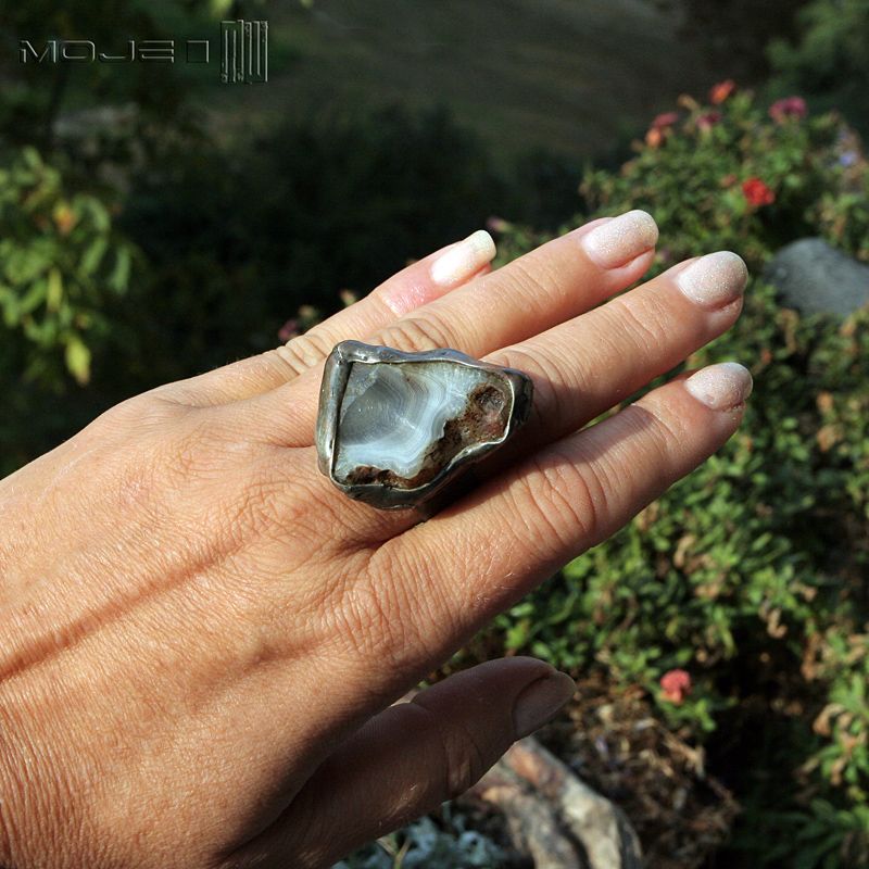 Pierścień z naturalnej bryły surowego agatu w odcieniach szarości i bieli z odrobiną brązu. Kamień oprawiony jest minimalistycznie w miedź - cynowaną, patynowaną i przecieraną. Szeroka obrączka.