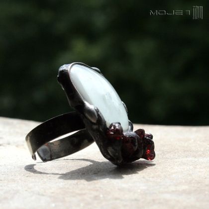 Łagodny w kształtach pierścień utrzymany w bieli i ciemnym bordo. Białe oko wytopione jest z mlecznego szkła, a na dole zdobią je kamyczki surowego granatu. Całość oprawiona jest w miedź - cynowaną, patynowaną i przecieraną.