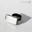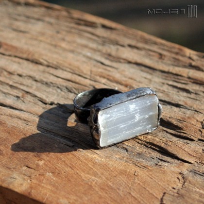 Pierścionek z surową bryłką selenitu. Kamień ma biało-perłową barwę i fakturę drobnych podłużnych prążków. Oprawiony jest minimalistycznie w cynowaną, patynowaną i przecieraną miedź.