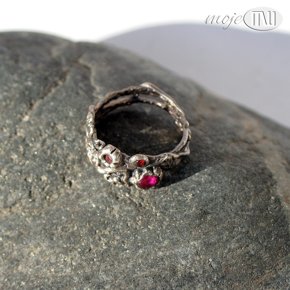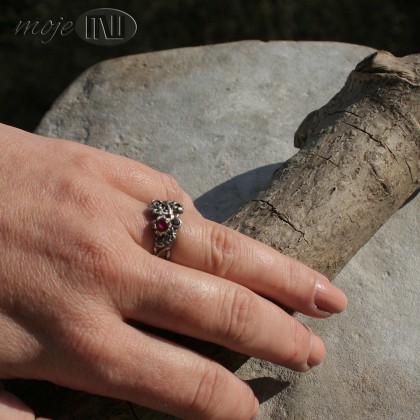 Delikatny pierścionek z ręcznie formowanego srebra wysokiej próby (deklarowana próba to 925, natomiast może ona wynosić nawet 980). Zdobią go drobne kwiatuszki i gałązki oraz cyrkonie - jedna w kolorze fuksji i dwie mniejsze, bordowe. Srebro jest oksydowane i częściowo przecierane dla wydobycia detali.