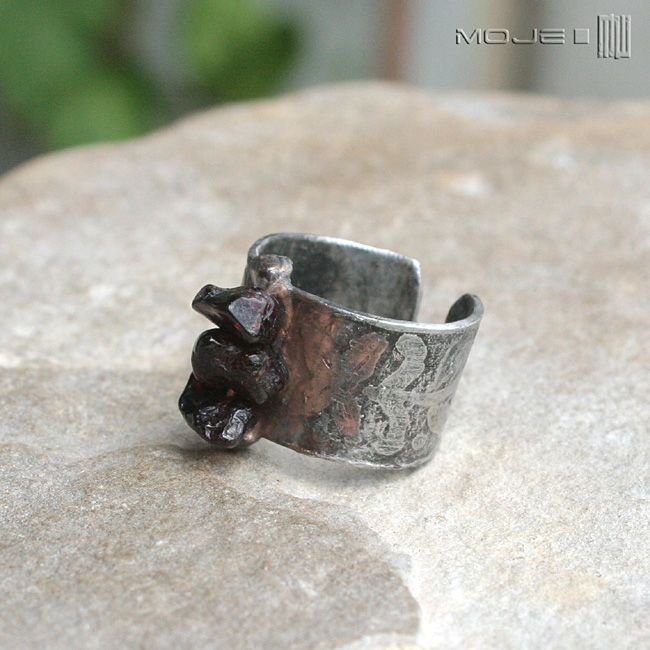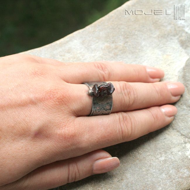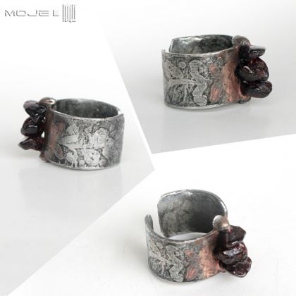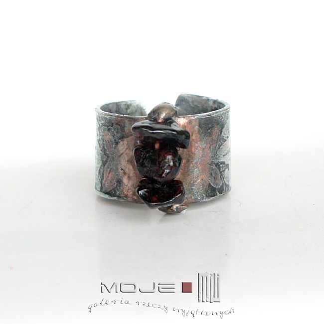 Szeroka obrączka z motywami florystycznymi, ozdobiona kamyczkami granatu. Surowość kamieni i obrączki nadaje całości specyficzny, nieco rustykalny charakter.