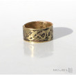Mosiężna obrączka unisex. Jest ozdobiona wytrawionymi w metalu motywem nieregularnej plecionki. Sposób wykonania sprawia, że jest surowa, rustykalna, nieco etniczna. Jest delikatnie patynowana dla wydobycia wzorów.