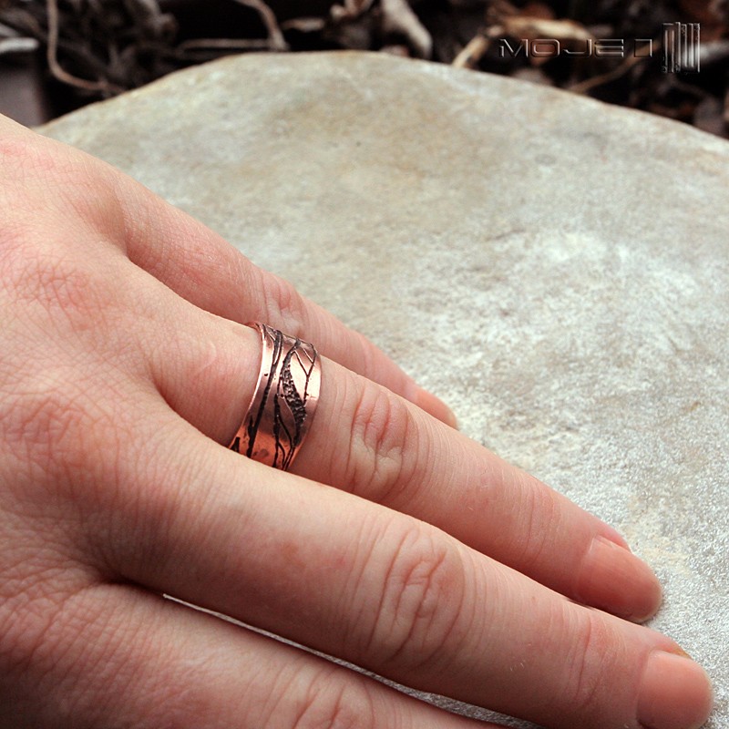 Miedziana obrączka unisex - pasuje na damską i męską rękę. Ozdabiają ją nieregularne falujące linie. Jest surowa, rustykalna, nieco etniczna. Jest delikatnie patynowana i przecierana dla wydobycia wzorów.