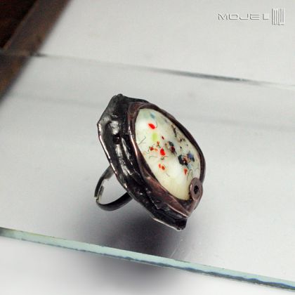 Niepowtarzalny pierścionek ze szklanym okiem w białym kolorze z zatopionymi kolorowymi drobinkami, zrobionym przeze mnie metodą fusingu, czyli topienia szkła w wysokiej temperaturze. Szklane oko oprawione jest w cynowaną, patynowaną i przecieraną miedź.