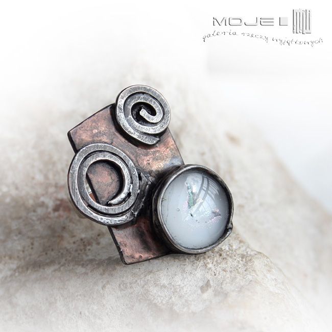 Pierścionek z miedzi, ozdobiony białym, delikatnie opalizującym okiem ze szkła. Szkło wypaliłam metodą fusingu w temperaturze 800 stopni, przez co jest trwałe i mniej podatne na zarysowania.