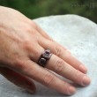 Pierścionek / obrączka z kamyczkami surowego szafiru. Struktura powierzchni powstała z miedzi w technice elektroformowania, stąd nieregularna faktura. Miedź jest delikatnie patynowana i przecierana dla wydobycia faktury.