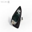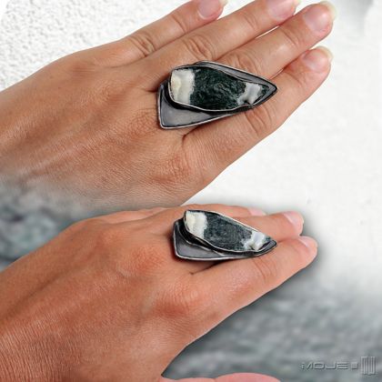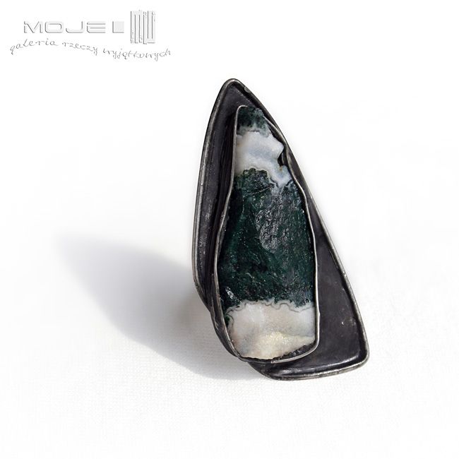 Pierścionek z surową bryłą agatu mszystego z Brazylii. Kamień w kolorze bieli i bardzo ciemnej zieleni, oprawiony jest w cynowaną, patynowaną i przecieraną miedź.