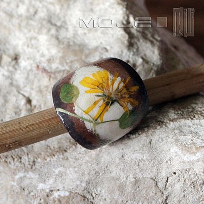 Drewniany sygnet z wiosennymi motywami kwiatowymi w zieleniach i żółciach.
