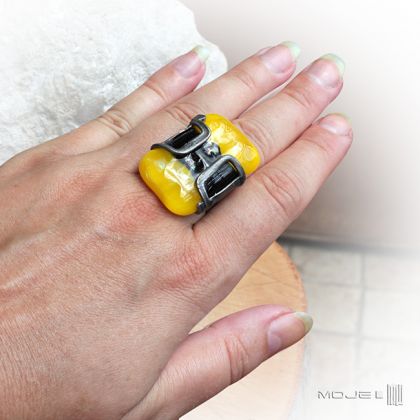 Szklany pierścień z intensywnie żółtym szklanym okiem oraz czarno-złotawym pasem, zrobiony przeze mnie metodą fusingu, czyli topienia szkła w wysokiej temperaturze. Szkło obrabiane w ten sposób jest trwałe, bardziej odporne na zarysowania. Szklane oko oprawione jest w cynowaną, patynowaną i przecieraną miedź.
