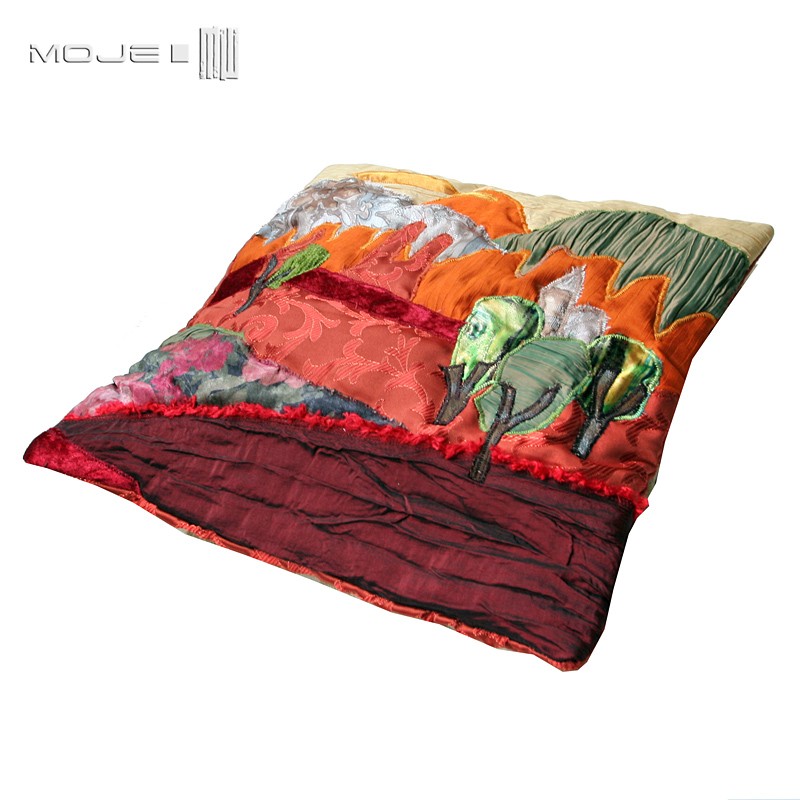 Poszewka dekoracyjna na poduszkę, wykonana z różnych materiałów techniką patchwork.