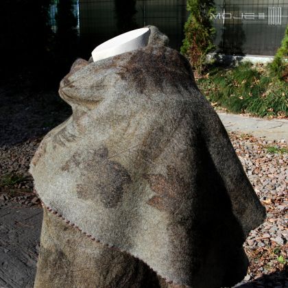 Ciepły szal z parzonej wełny (wełna 80%, poliamid 20%), który stał się niepowtarzalny dzięki technice, którą go ozdobiłam. Jest to druk ekologiczny, w którym wykorzystuje się naturalne barwniki zawarte w roślinach - liściach, kwiatach, korze itp. Odpowiednia obróbka sprawia, że barwniki wnikają w tkaninę i pozostawiają na niej rysunek. Proces ten jest długotrwały (może trwać kilka dni), zawsze niepowtarzalny.