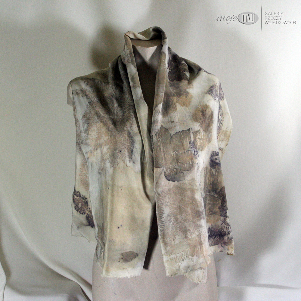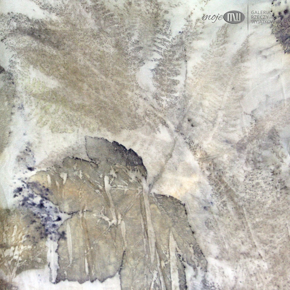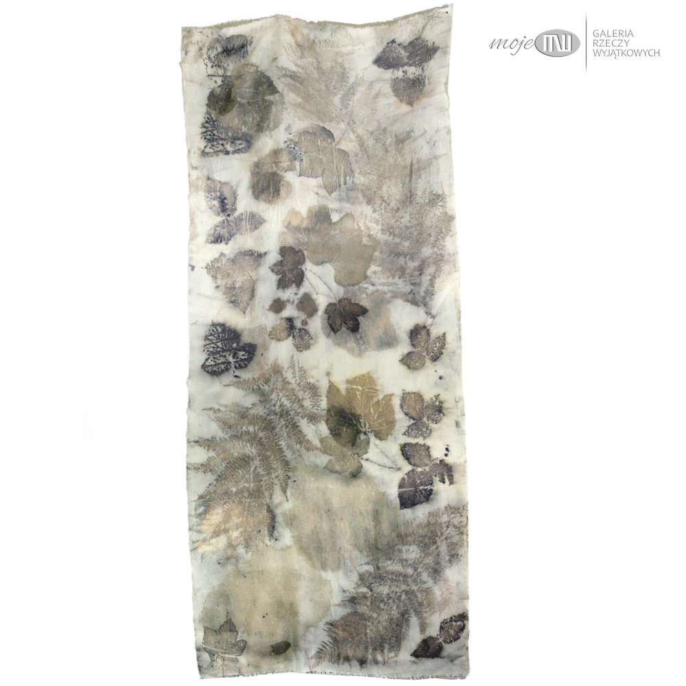 Jedwabny cieniutki szal ozdobiony techniką druku ekologicznego, w którym wykorzystuje się naturalne barwniki zawarte w roślinach - liściach, kwiatach, korze itp. Odpowiednia obróbka sprawia, że barwniki wnikają w tkaninę i pozostawiają na niej rysunek. Proces ten jest długotrwały (może trwać kilka dni), zawsze niepowtarzalny i efekt końcowy można przewidzieć w bardzo niewielkim stopniu.