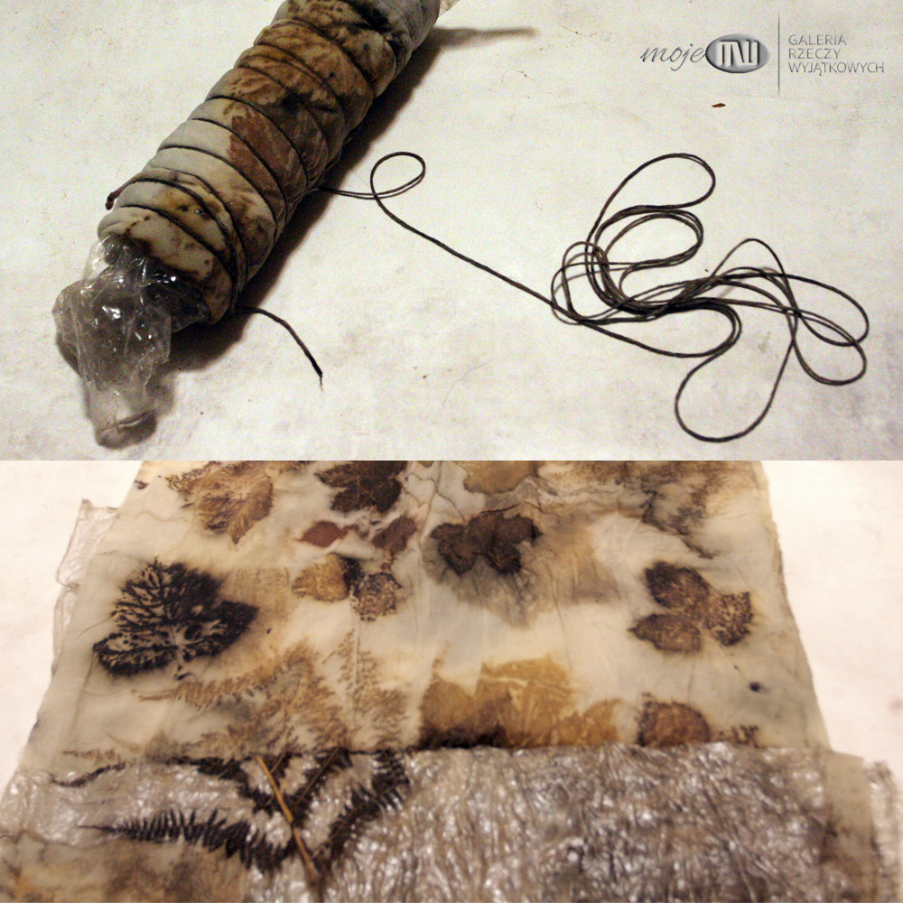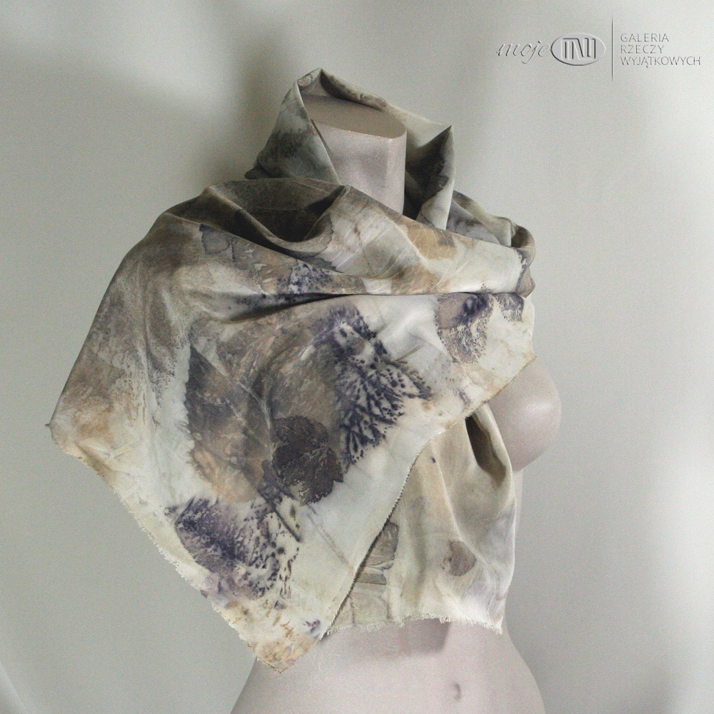 Ten szal jest z cienkiego jedwabiu barwionego m.in. liśćmi paproci, klonu, jeżyn i innymi.