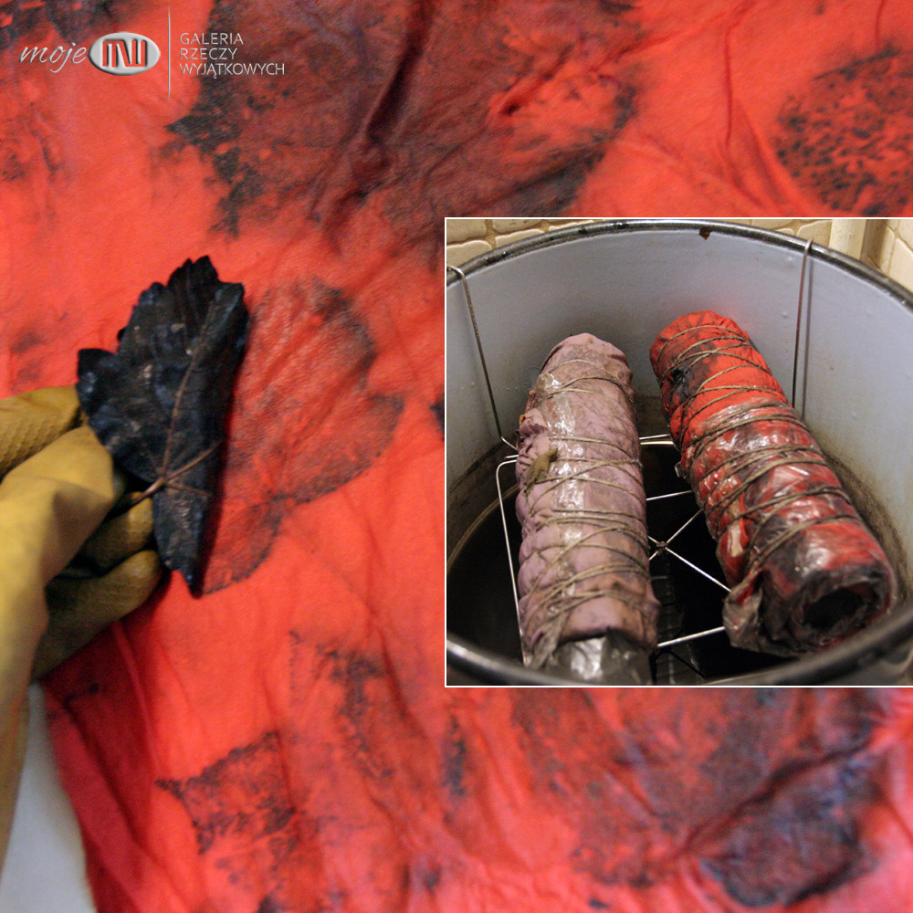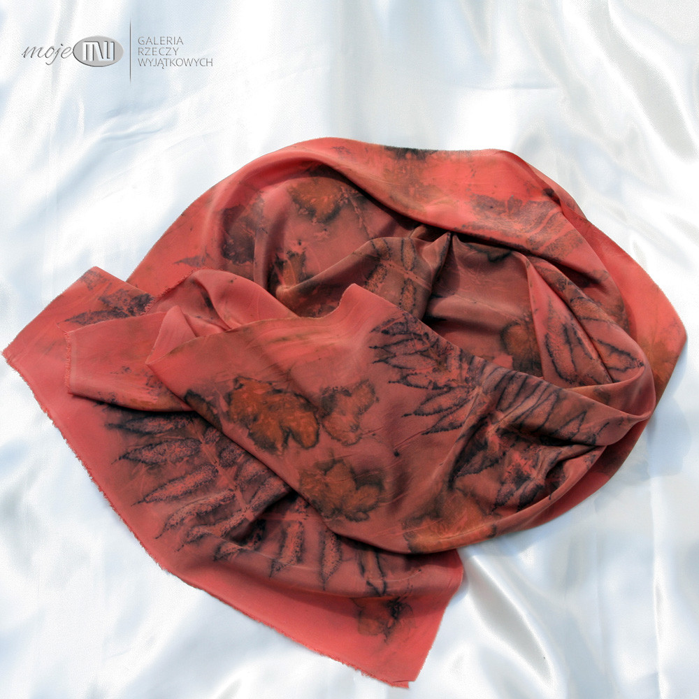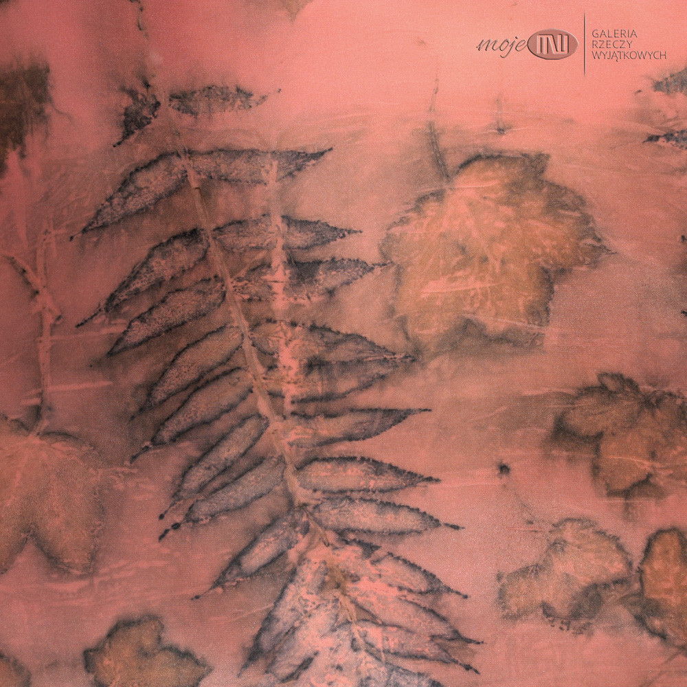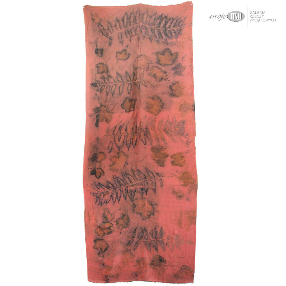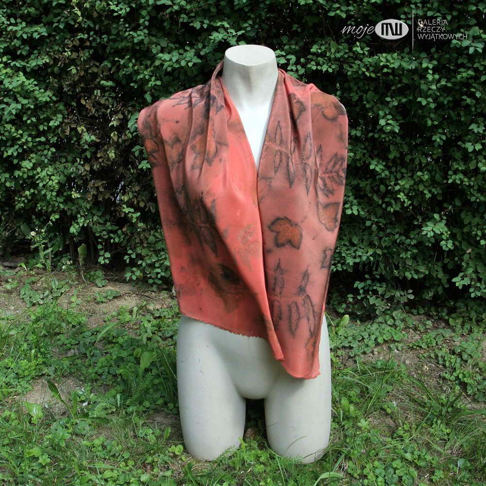 Jedwabny cieniutki szal, który ozdobiłam techniką druku ekologicznego, gdzie wykorzystuje się naturalne barwniki zawarte w roślinach - liściach, kwiatach, korze itp. Odpowiednia obróbka sprawia, że barwniki wnikają w tkaninę i pozostawiają na niej rysunek. Proces ten jest długotrwały (może trwać kilka dni), zawsze niepowtarzalny i efekt końcowy można przewidzieć w bardzo niewielkim stopniu.