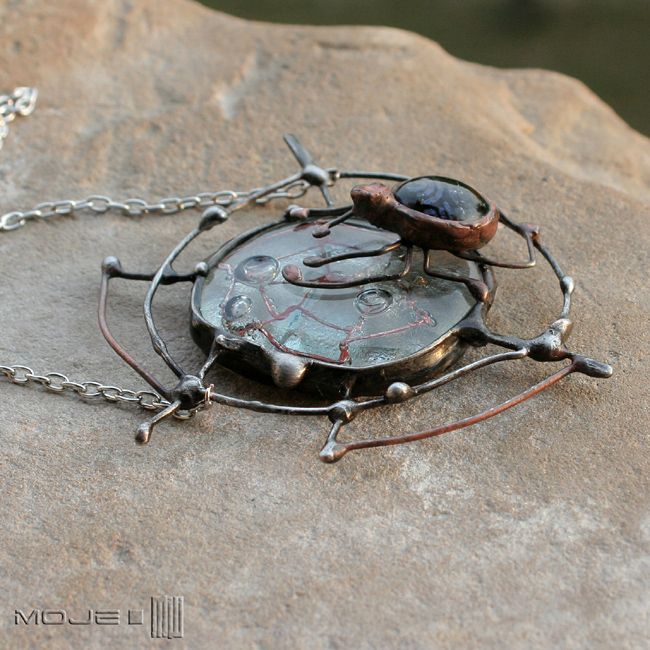 Charakterystyczny i niepowtarzalny wisior ze szkła i miedzi. Dichroiczny pająk siedzi na swej szklano-miedzianej pajęczynie i czeka na ofiarę...