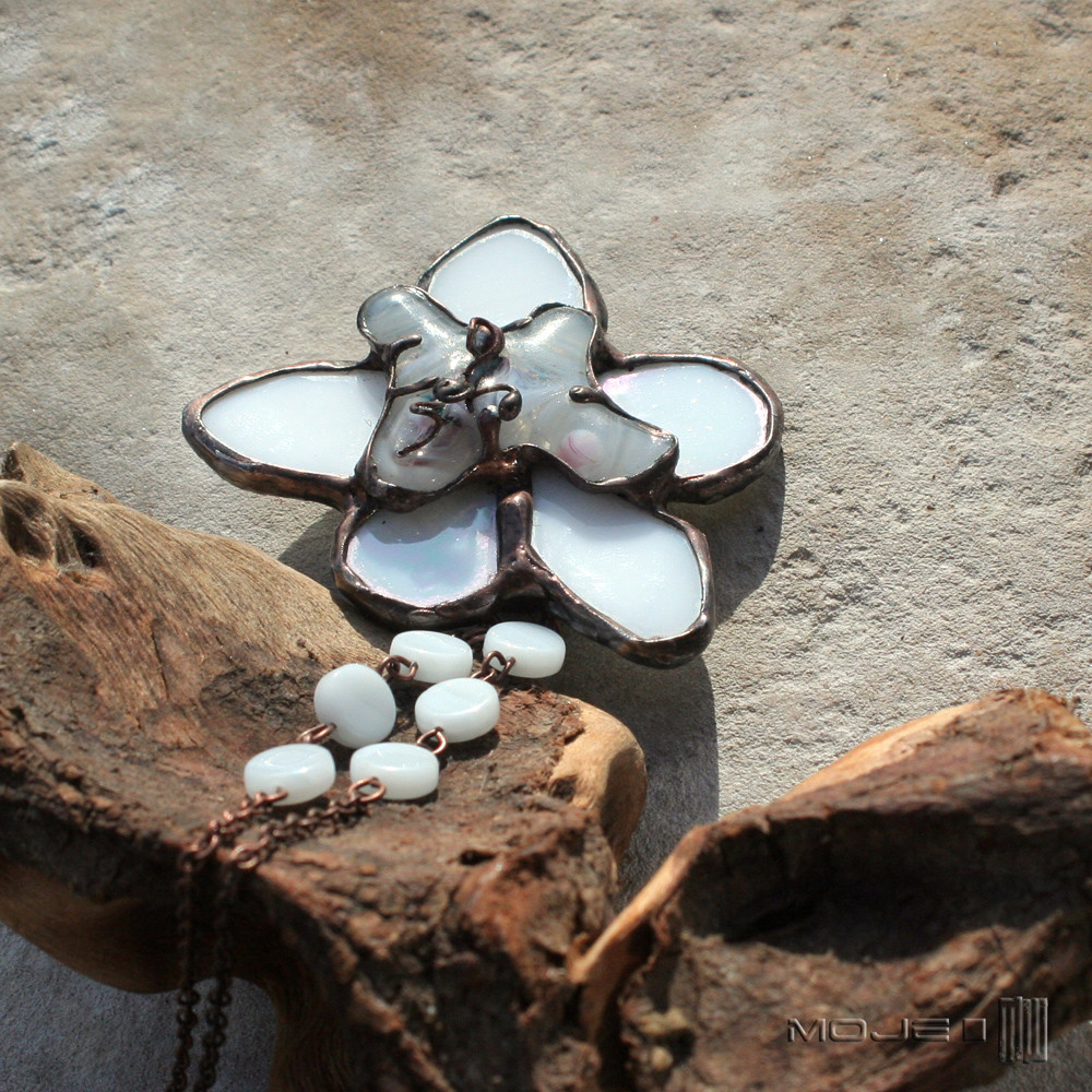 Zawieszony jest na łańcuszku w kolorze miedzianym i ozdobionym białymi szklanymi pastylkami.