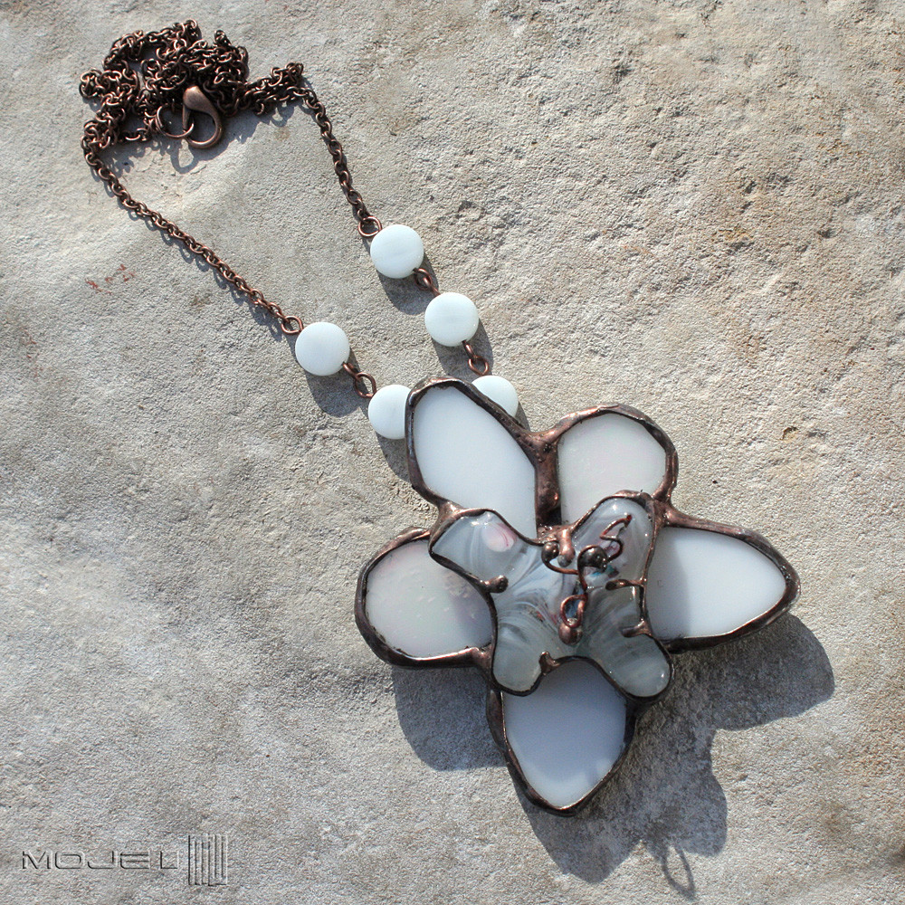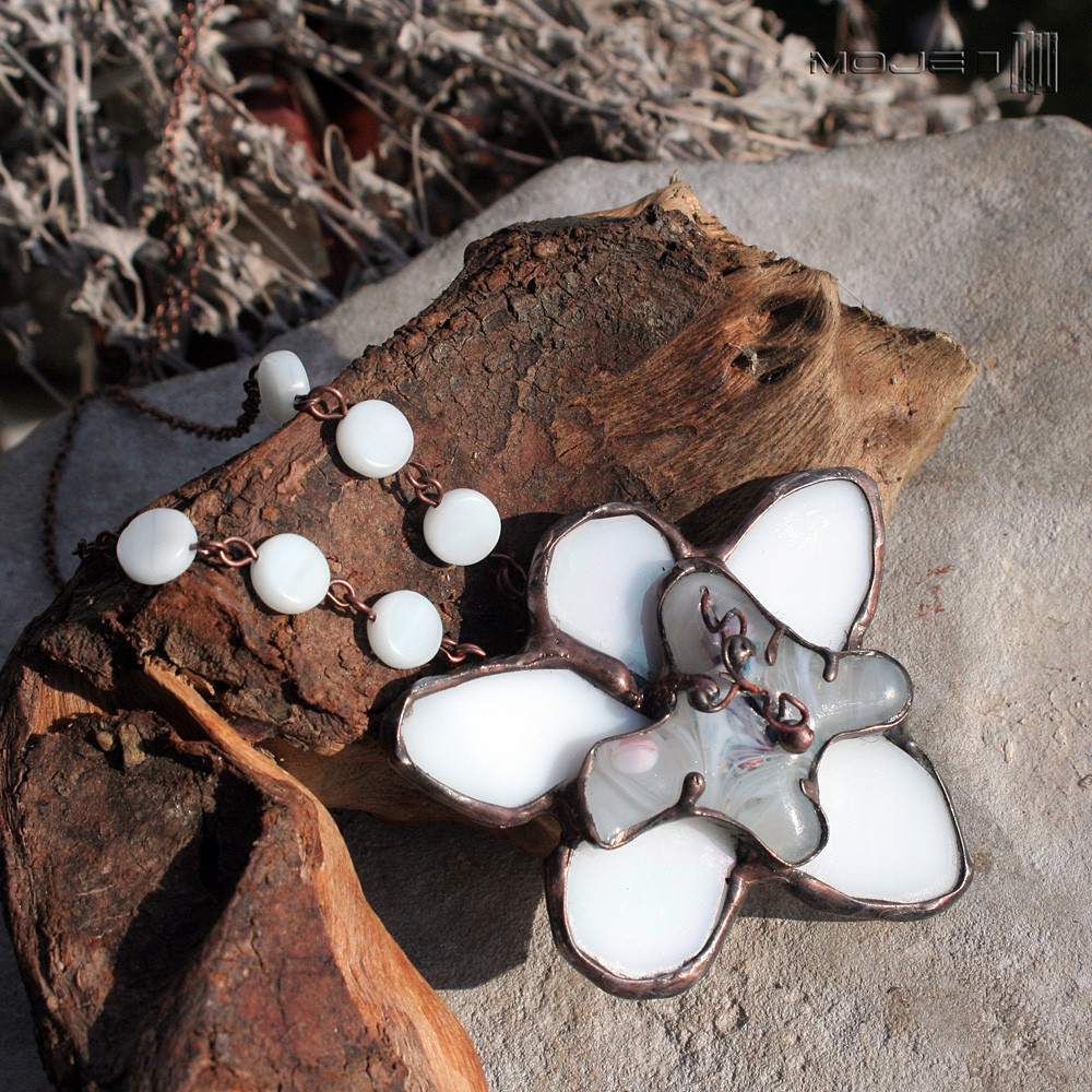 Kwiat oprawiony jest w miedź - pokrytą cyną, patynowaną i przecieraną. Szkło opalizuje delikatnie tęczowo.