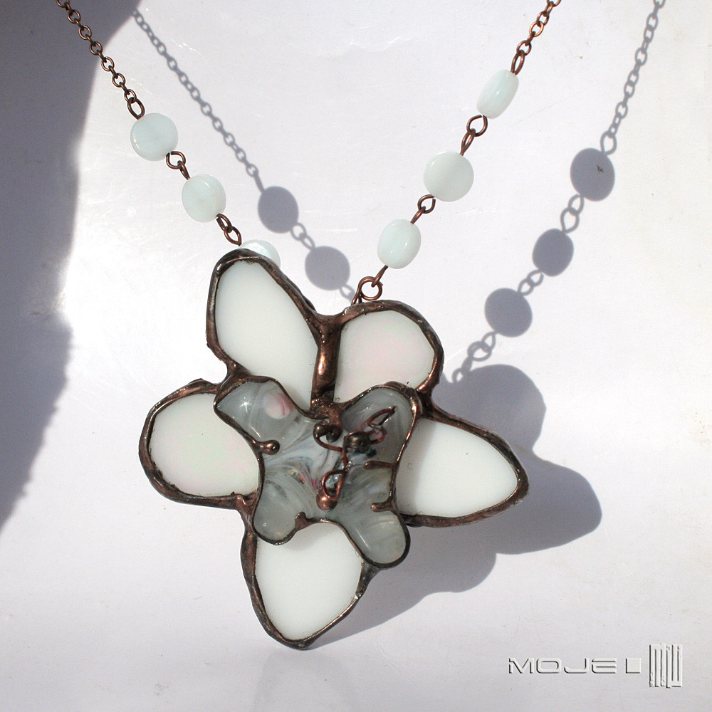Wisior w formie stylizowanego kwiatu ze szkła witrażowego z oprawą witrażową Tiffany.