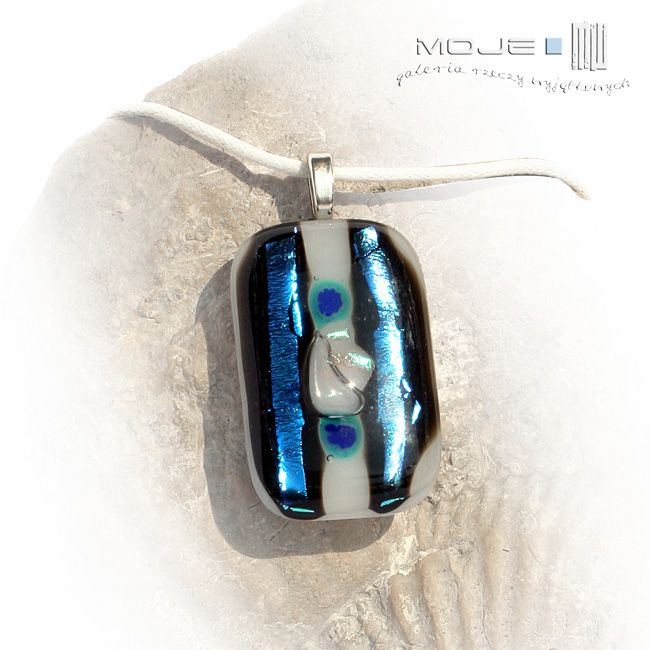 Szklany, niepowtarzalny wisior, wytopiony przeze mnie z białego mlecznego szkła, opalizującego szkła dichroicznego i Millefiori. W słońcu ślicznie błyszczy i delikatnie się mieni. Zawieszony jest na białym woskowanym sznurku. Wesoła i kolorowa ozdoba do letnich sukienek.
