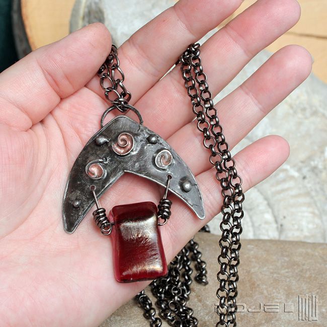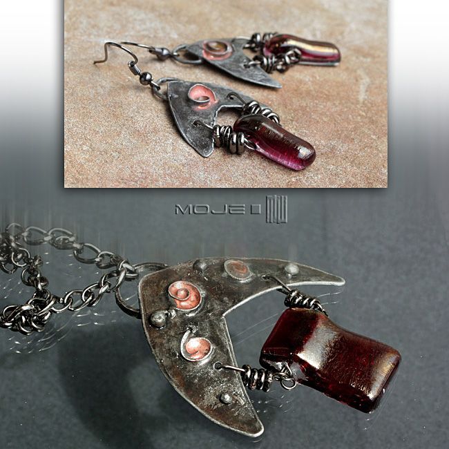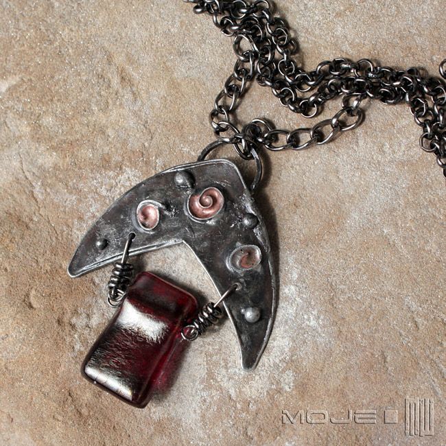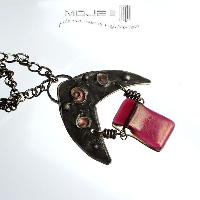 Wisior o surowym, trochę etnicznym wyglądzie. Wykonany z miedzi - cynowanej, patynowanej na ciemny grafit, przecieranej i drapanej.