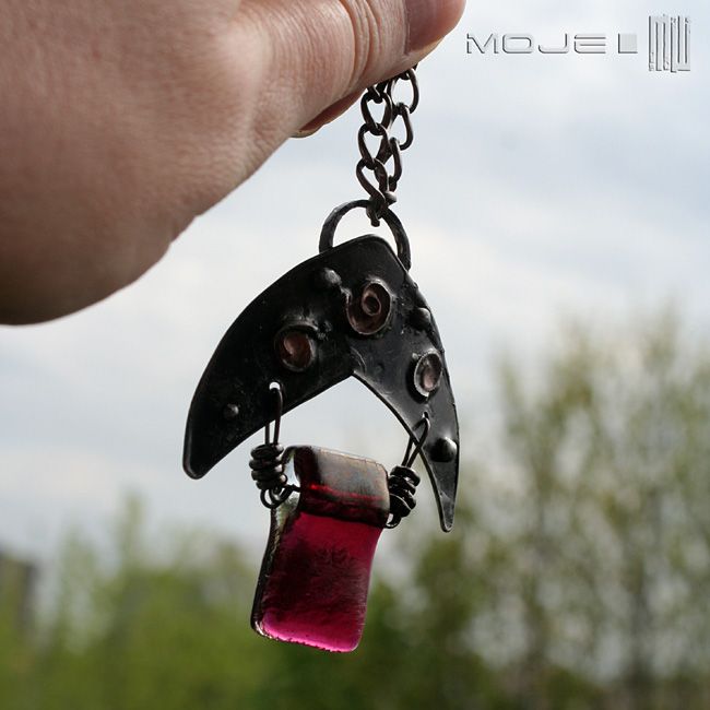 Ozdobą jest szklana zawieszka wykonana przeze mnie metodą fusingu, czyli wypalania szkła w wysokiej temperaturze. Kolor szkła - głęboka fuksja / bordowy ze złotą poświatą.