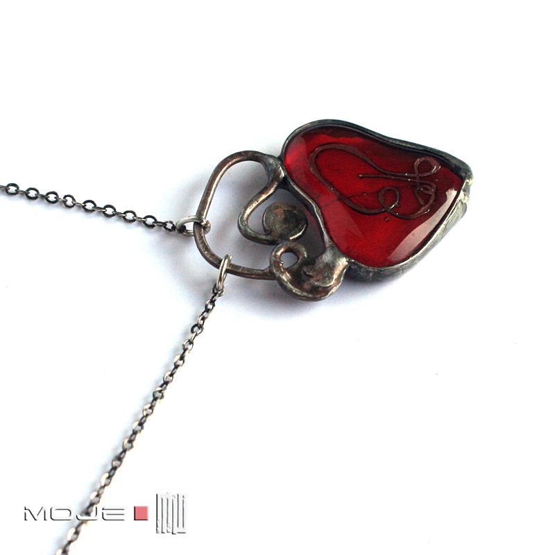 Serce wytopiłam metodą fusingu z czerwonego szkła (fusing - topienie szkła w temp. min. 800 stopni). Oprawione jest techniką Tiffany w cynowaną, patynowaną i przecieraną miedź. Zawieszone na łańcuszku w kolorze srebrnym o dł. 62 cm