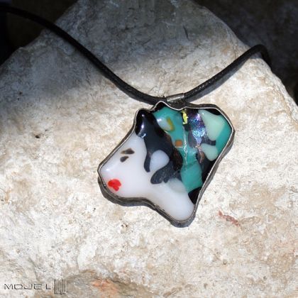 Oryginalny i nieco humorystyczny wisior przedstawiający kobiecą głowę z profilu, wykonany przeze mnie ze szkła i miedzi. Szkło wytopiłam w temperaturze min. 800 stopni metodą fusingu.
