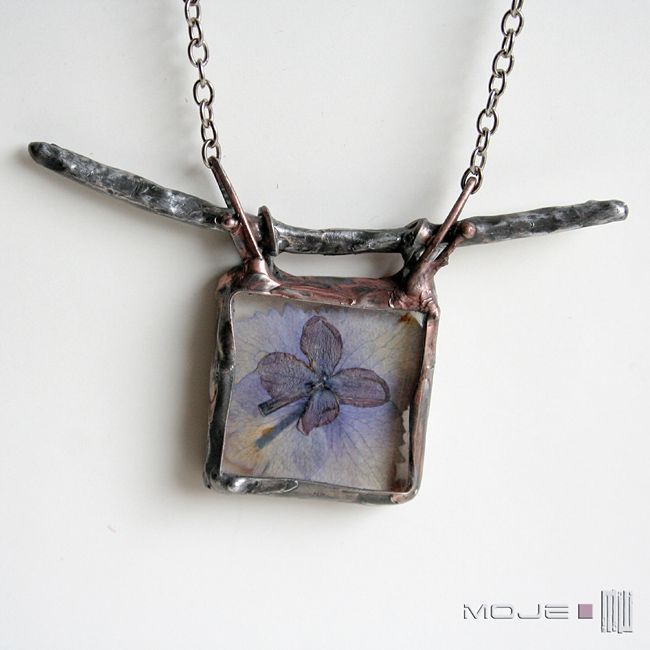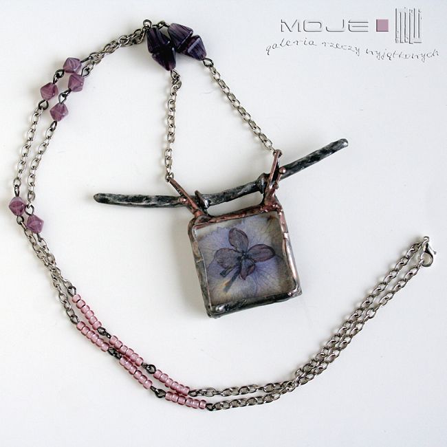 Czarowny wisior-zielnik z zamkniętym w jego wnętrzu fragmentem wiosny i lata. Suszone kwiaty bzu i hortensji zamknięte między dwoma taflami bezbarwnego szkła. Całość oprawiona jest w miedź - cynowaną, patynowaną i przecieraną. Wisior zawieszony jest na łańcuszku w kolorze srebrnym. Dodatkową ozdobą są szklane bladofioletowe koraliki. Intensywność barwy suszonego kwiatu z czasem może być mniejsza, jest to naturalny proces.