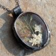 Czarowny wisior-zielnik z zamkniętym w jego wnętrzu fragmentem lata. Suszone trawy i kwiatki zamknięte są między dwoma taflami bezbarwnego szkła. Wierzchnią taflę wytopiłam metodą fusingu - jest leciutko wypukła, przez co nadaje wisiorkowi przestrzenności. Całość oprawiona jest w miedź - cynowaną, patynowaną i przecieraną. Wisior zawieszony jest na łańcuszku w kolorze mosiężnym.