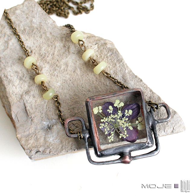 Czarowny wisior-zielnik z zamkniętym w jego wnętrzu fragmentem wiosny i lata. Suszone kwiaty bzu i polnej marchwi zamknięte między dwoma taflami bezbarwnego szkła. Całość oprawiona jest w miedź - cynowaną, patynowaną i przecieraną. Wisior zawieszony jest na łańcuszku w kolorze mosiężnym. Dodatkową ozdobą są oponki bladozielojego jaspisu. Intensywność barwy suszonego kwiatu z czasem może być mniejsza, jest to naturalny proces.
