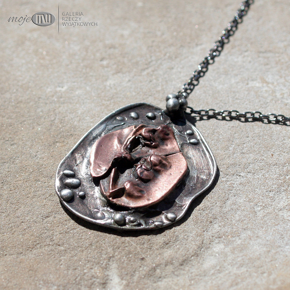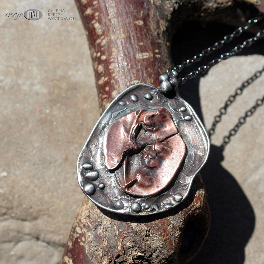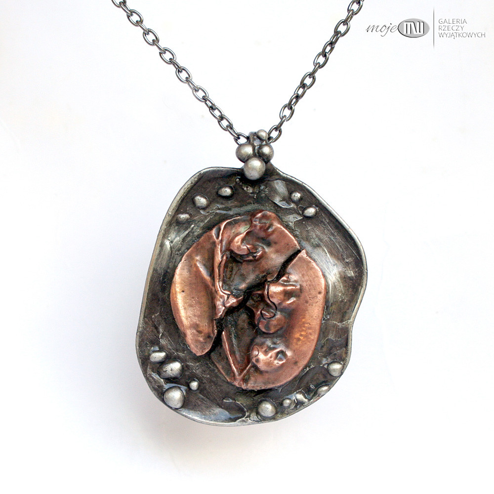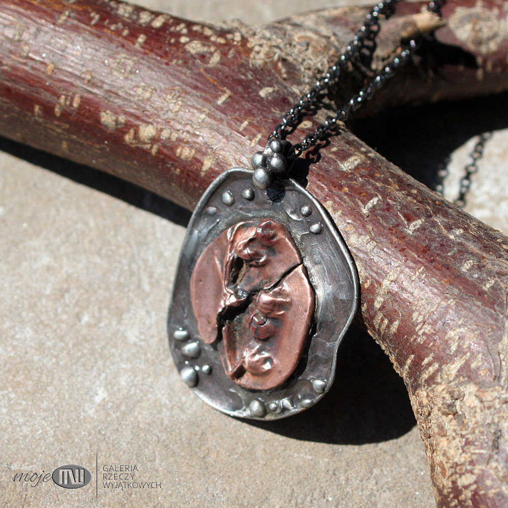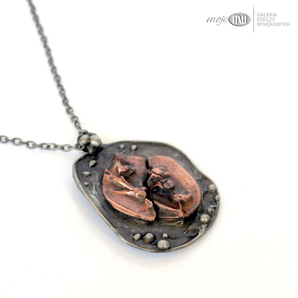 Wisior ze stylizowanym wizerunkiem konwalii - częściowo z ręcznie formowanej miedzianej glinki, którą potem wypaliłam w temperaturze 970 stopni C. Ozdobny element został umieszczony na miedzianej blasze pokrytej cyną, patynowanej i przecieranej dla wydobycia drobnych detali. Wisior zawieszony jest na łańcuszku w kolorze grafitowym - zazwyczaj dodaję łańcuszek o długości ok. 60-70 cm, ale klient może podać długość, która go interesuje.